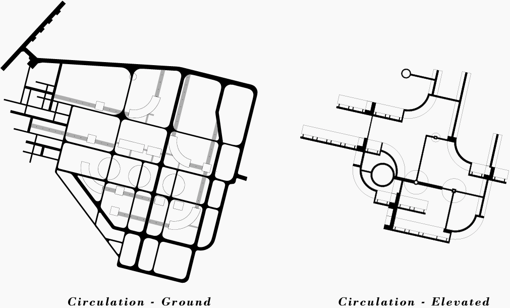 My goal was to create a campus-like environment, and to wrap elevated housing units around the existing infrastructural elements. After devising a circulation strategy for the site plan, I devised circulation routes for the upper floors.