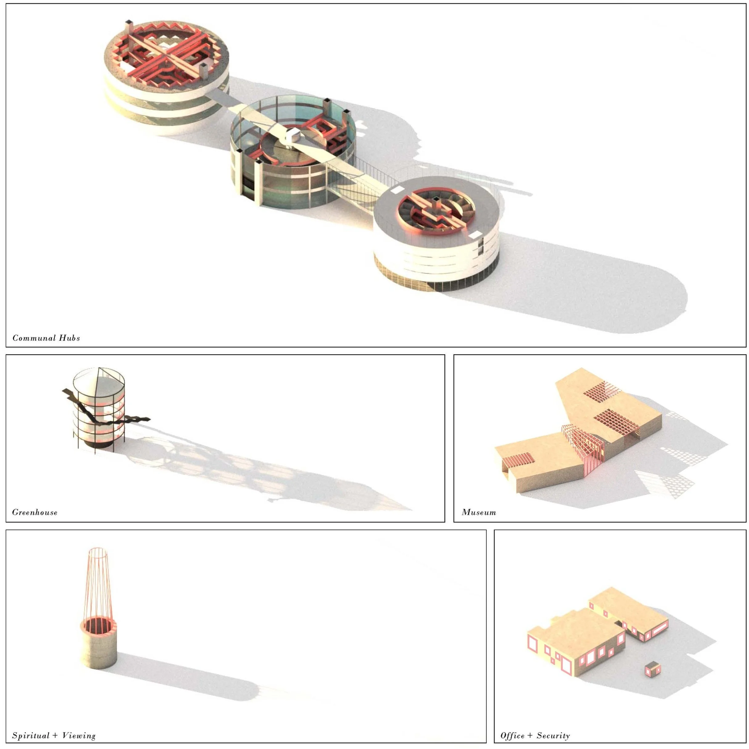 The vacant infrastructural structures are revitalized to become educational and recreational hubs. The programming includes a greenhouse, museum, office + security space, and spiritual space.